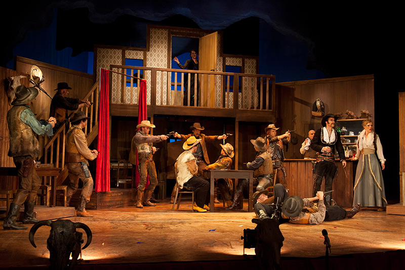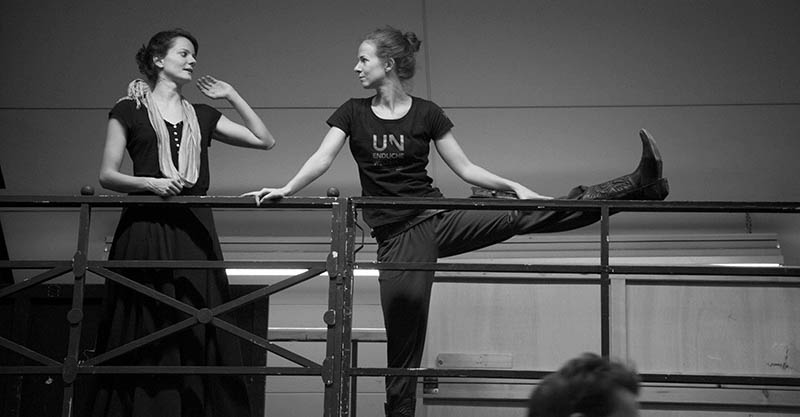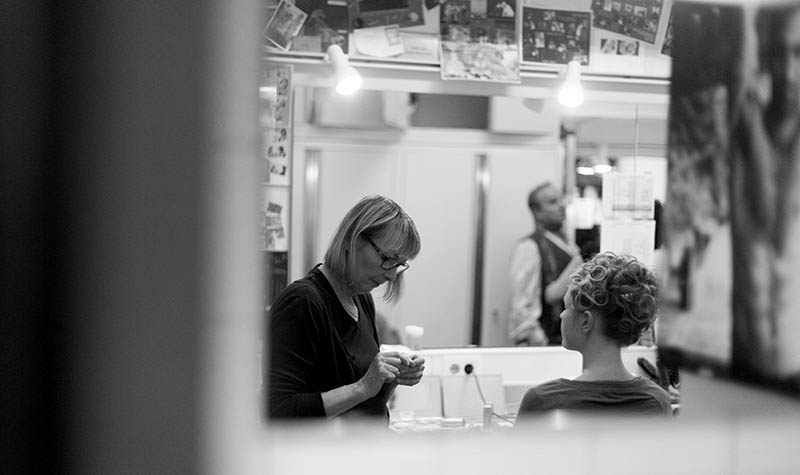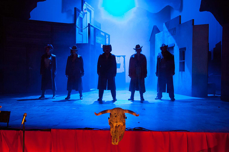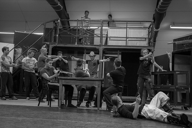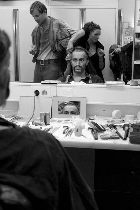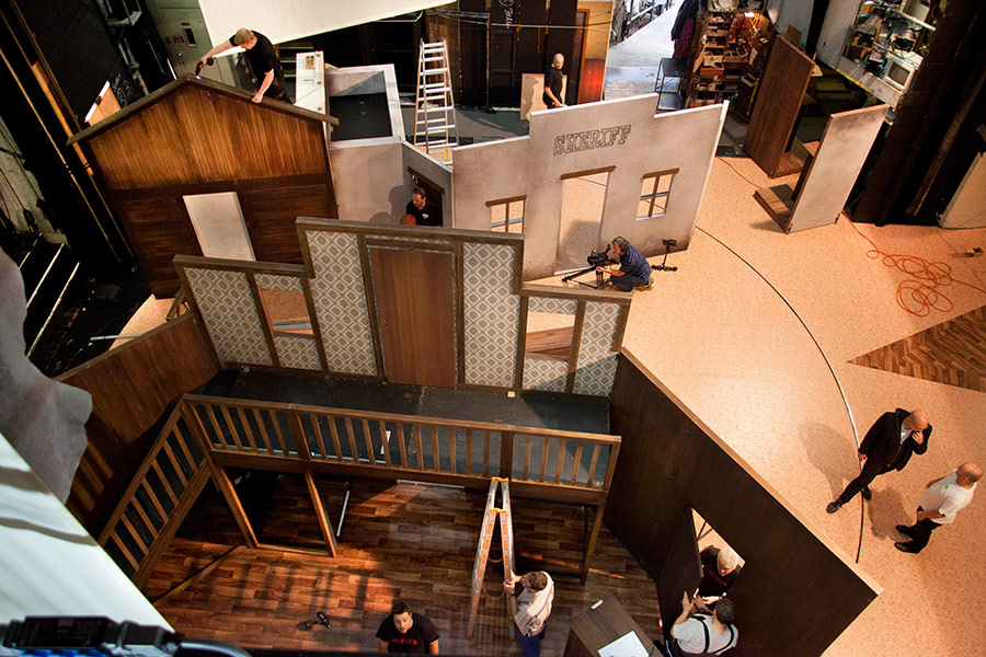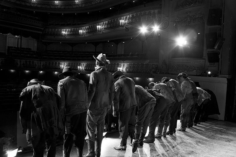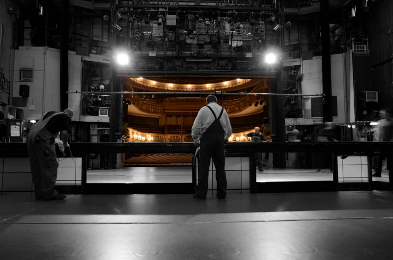 Normalerweise erfahre ich Theater aus der Zuschauerperspektive: Ich kaufe mir eine Karte, führe anregende Gespräche mit anderen Theaterbesuchern und begebe mich dann beim ersten Klingeln gespannt zu meinem Sitzplatz. Das letzte Flüstern verstummt in der Dunkelheit. Der Vorhang gleitet auf, das Stück beginnt. Für kurze Zeit nehmen die Schauspieler mich mit in eine fremde Welt. So kannte ich Theater bisher. Nun stehe ich mit der Kamera in der Hand im schmalen, dunklen Gang hinter den Kulissen, manchmal weht der Vorhang zur Seite und ich erhasche einen Blick von der Seite auf die Bühne, beobachte die Menschen auf, hinter, vor und über der Bühne. Während Schauspieler unten das neu eingerichtete Bühnenbild erkunden, bringen Beleuchter im „Bühnenhimmel“ Scheinwerfer an und ziehen letzte Schrauben fest. Der Bühnenbildner bespricht mit den Bühnentechnikern die Anordnung der Möbel und überprüft die Requisiten. Im Zuschauerraum sind der Regisseur und der musikalische Leiter in ein konzentriertes Gespräch vertieft. All dies geschieht gleichzeitig. Je länger ich beobachte, desto besser erkenne ich die Ordnung in dem scheinbaren Chaos, verstehe, wie die Arbeit jedes Einzelnen zum Ganzen beiträgt. Sechs Wochen lang durfte ich die Proben zu „Tombstone“ fotografisch begleiten. Dieses „Making of“ zeigt eine Auswahl meiner Bilder.