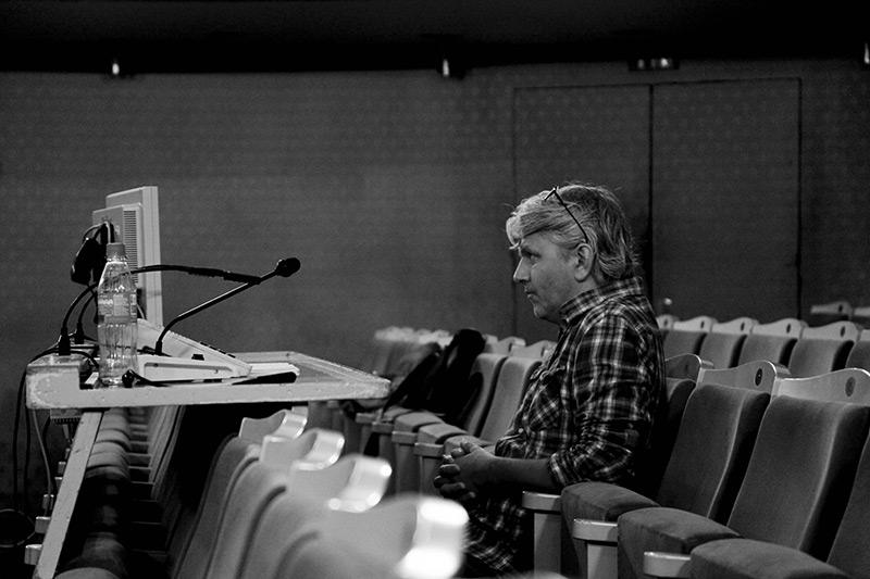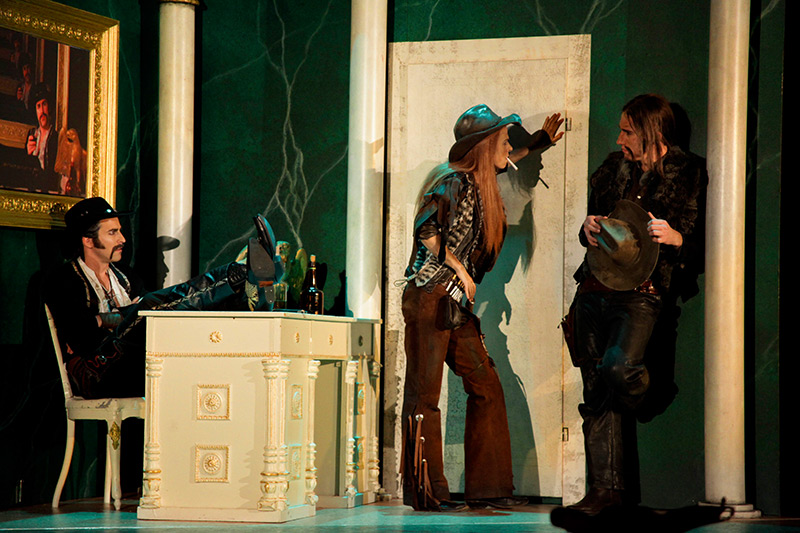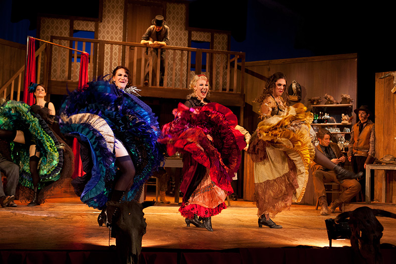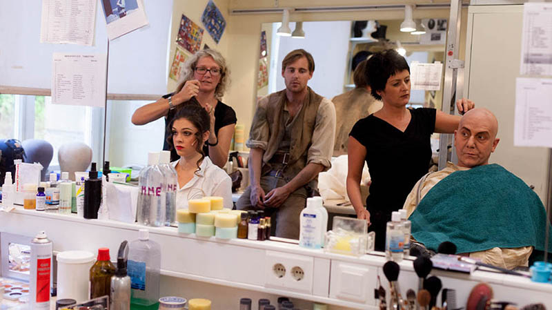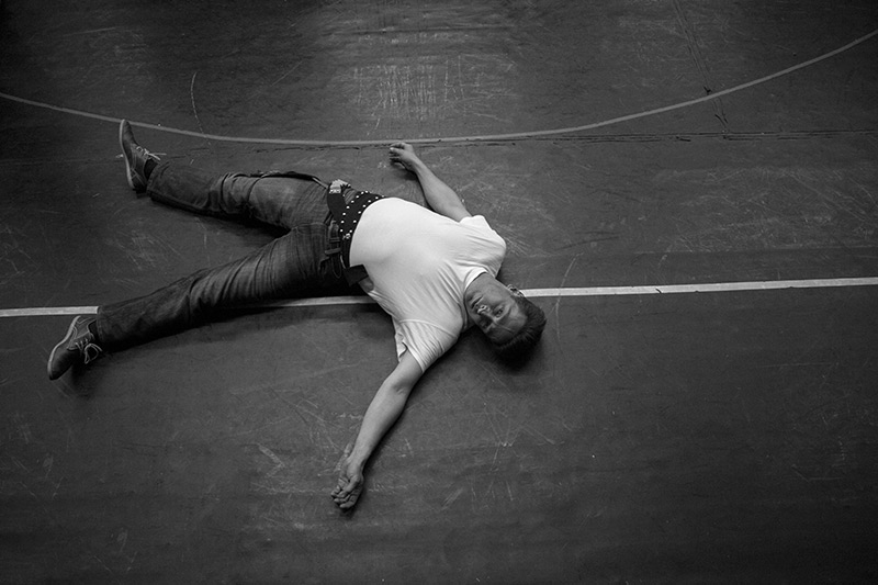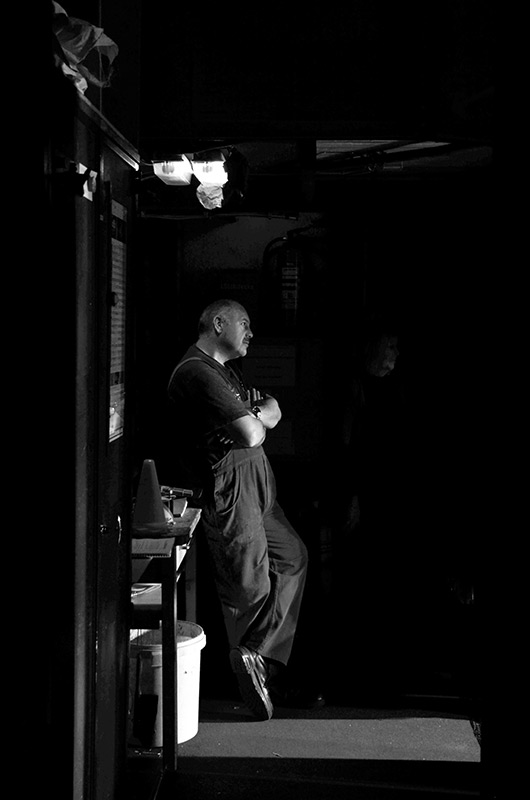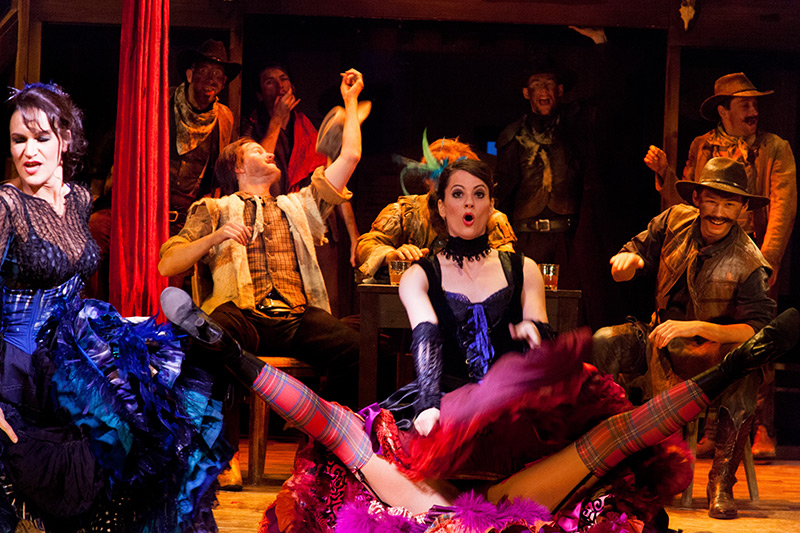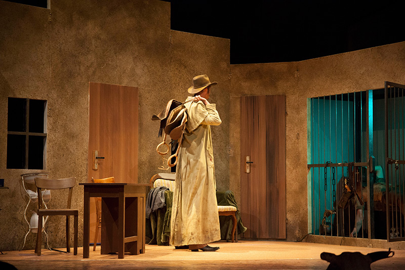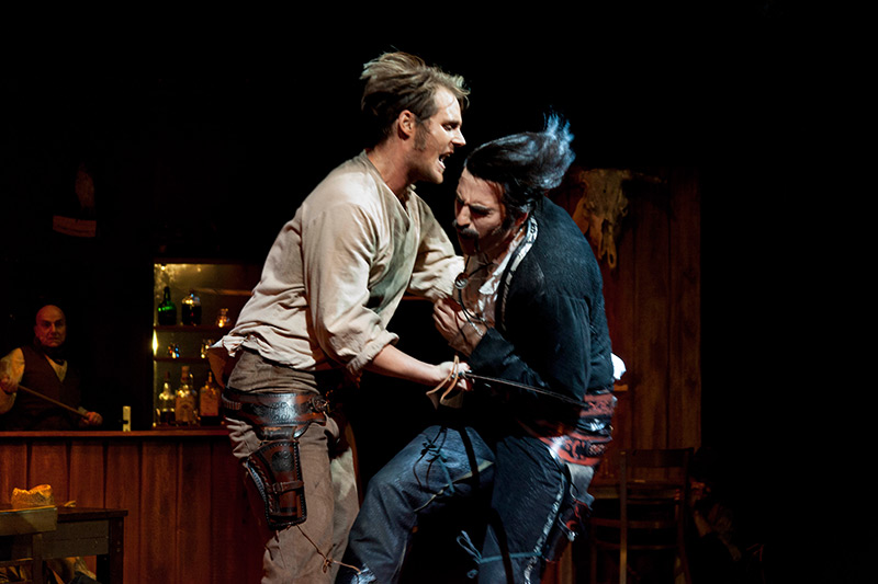 Normalerweise erfahre ich Theater aus der Zuschauerperspektive: Ich kaufe mir eine Karte, führe anregende Gespräche mit anderen Theaterbesuchern und begebe mich dann beim ersten Klingeln gespannt zu meinem Sitzplatz. Das letzte Flüstern verstummt in der Dunkelheit. Der Vorhang gleitet auf, das Stück beginnt. Für kurze Zeit nehmen die Schauspieler mich mit in eine fremde Welt. So kannte ich Theater bisher. Nun stehe ich mit der Kamera in der Hand im schmalen, dunklen Gang hinter den Kulissen, manchmal weht der Vorhang zur Seite und ich erhasche einen Blick von der Seite auf die Bühne, beobachte die Menschen auf, hinter, vor und über der Bühne. Während Schauspieler unten das neu eingerichtete Bühnenbild erkunden, bringen Beleuchter im „Bühnenhimmel“ Scheinwerfer an und ziehen letzte Schrauben fest. Der Bühnenbildner bespricht mit den Bühnentechnikern die Anordnung der Möbel und überprüft die Requisiten. Im Zuschauerraum sind der Regisseur und der musikalische Leiter in ein konzentriertes Gespräch vertieft. All dies geschieht gleichzeitig. Je länger ich beobachte, desto besser erkenne ich die Ordnung in dem scheinbaren Chaos, verstehe, wie die Arbeit jedes Einzelnen zum Ganzen beiträgt. Sechs Wochen lang durfte ich die Proben zu „Tombstone“ fotografisch begleiten. Dieses „Making of“ zeigt eine Auswahl meiner Bilder.